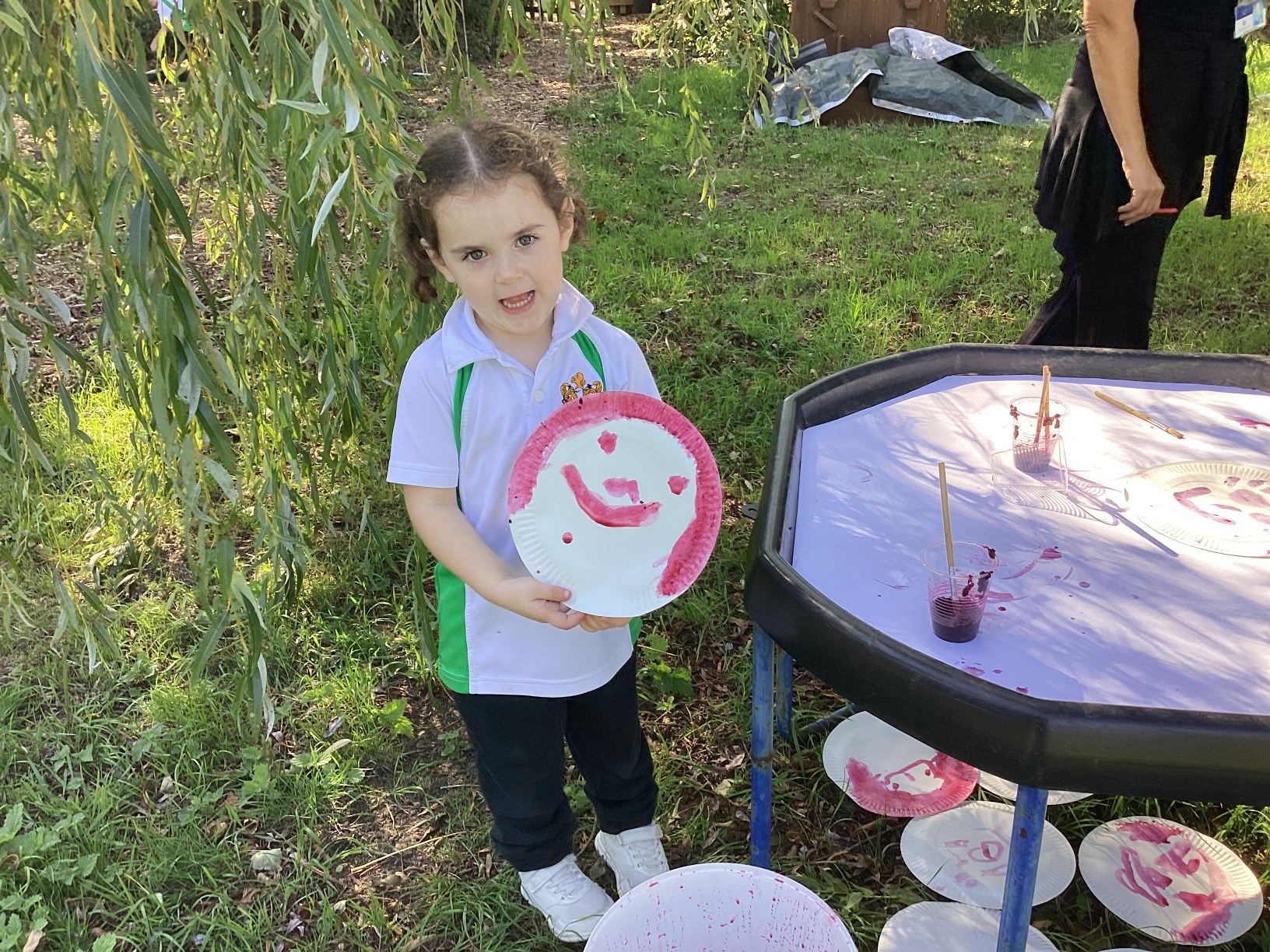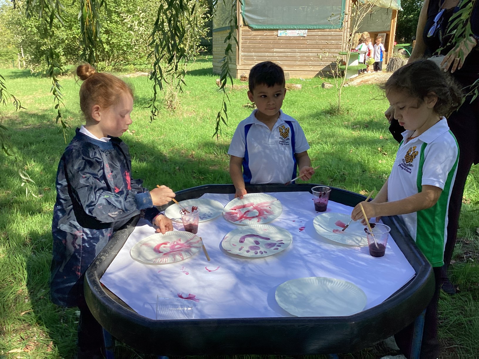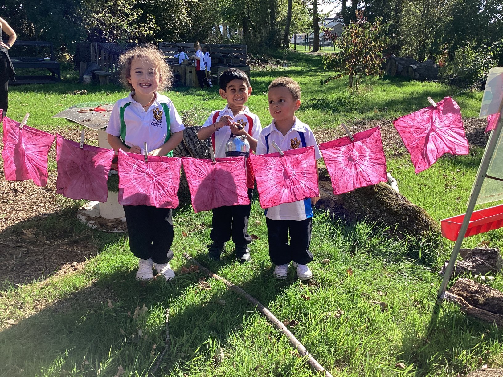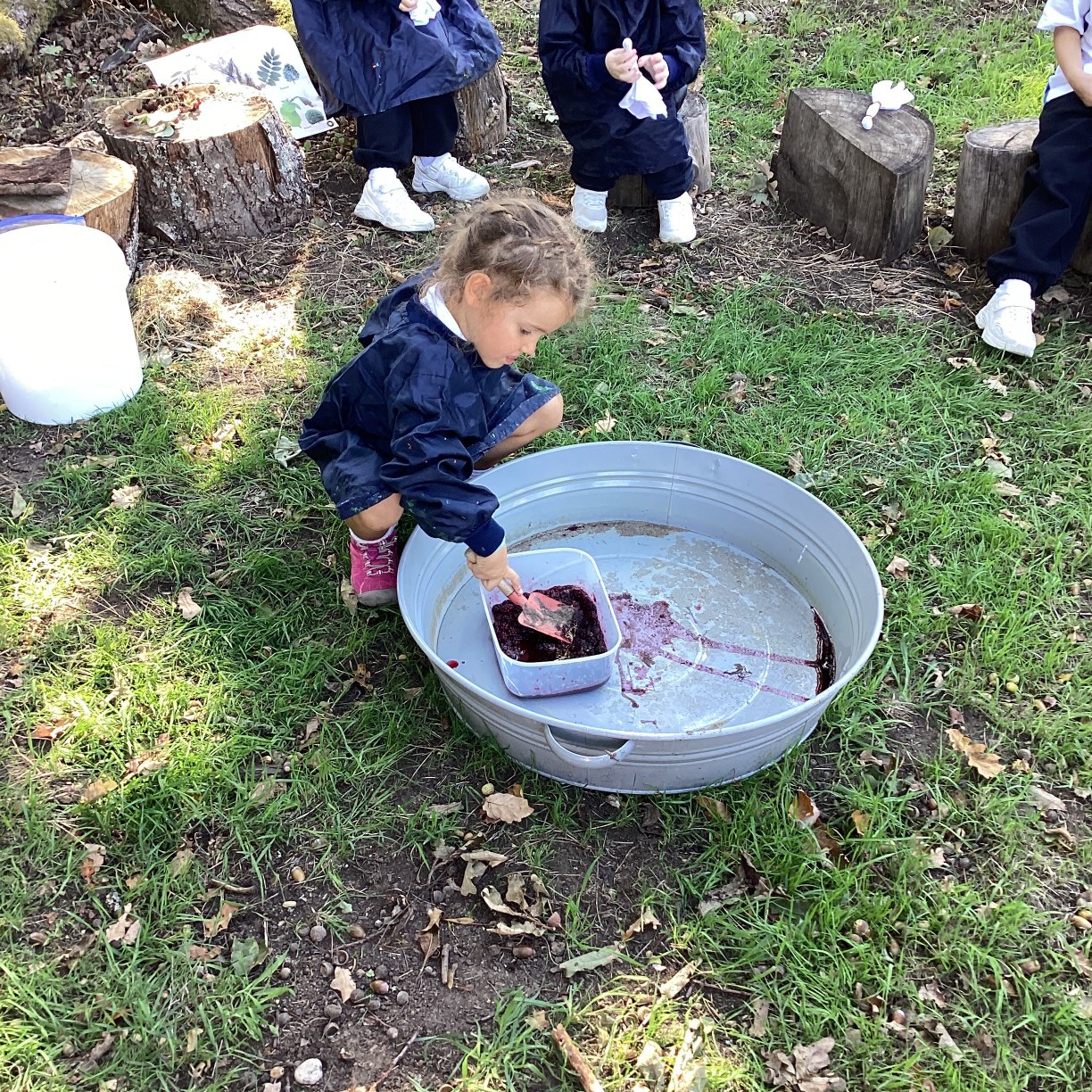 Reception turned things pink at Forest School. Using blackberries, we squashed them to extract the juice, then used this to tie dye our white hankies. Reception used the rest of the juice to paint faces and to add to some mud casseroles. We finished off by eating some blackberries and hearing a story about a mouse who went blackberry picking.
